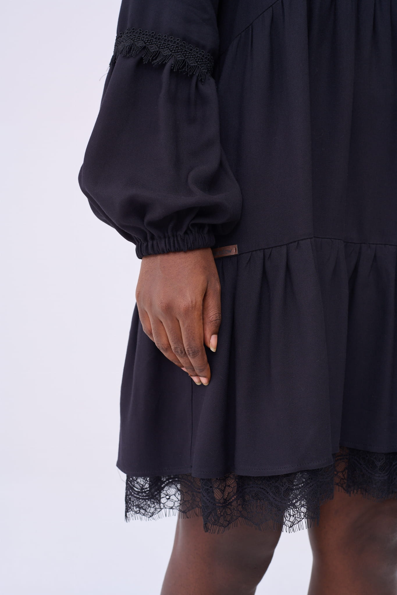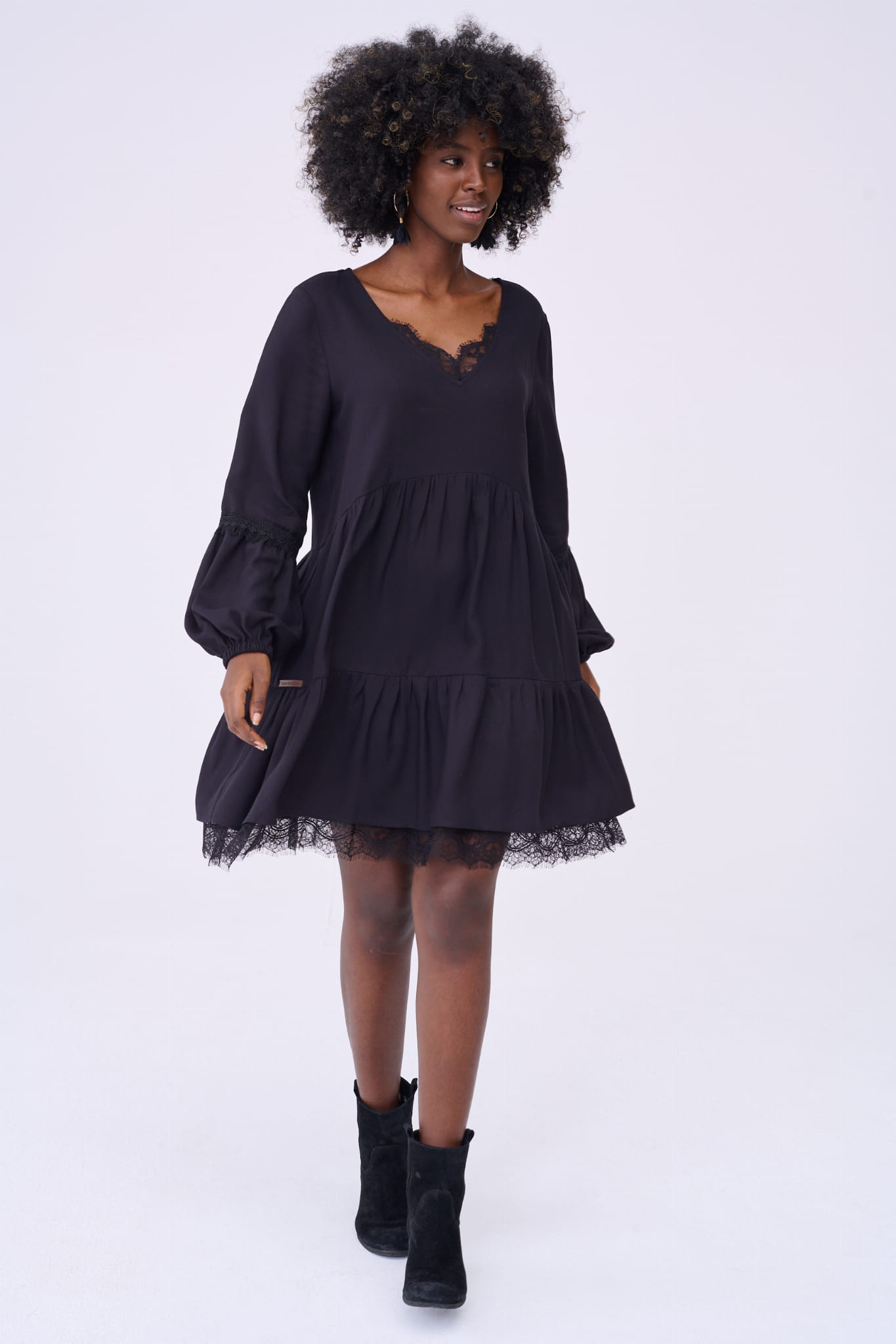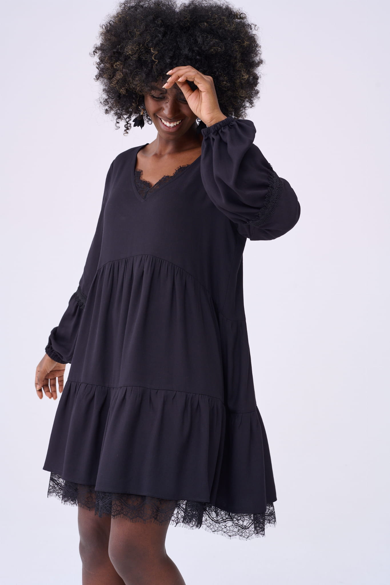 Romantyczne detale obejmują dekolt w kształcie litery V ozdobiony koronką z przodu i z tyłu, z regulowanymi wiązaniami z tyłu dla idealnego dopasowania. Długie rękawy są zaakcentowane koronkowymi wstawkami i elastycznymi mankietami, a spódnica ma dwa marszczone poziomy, każdy wykończony ozdobną koronką dla dodatkowego akcentu boho.