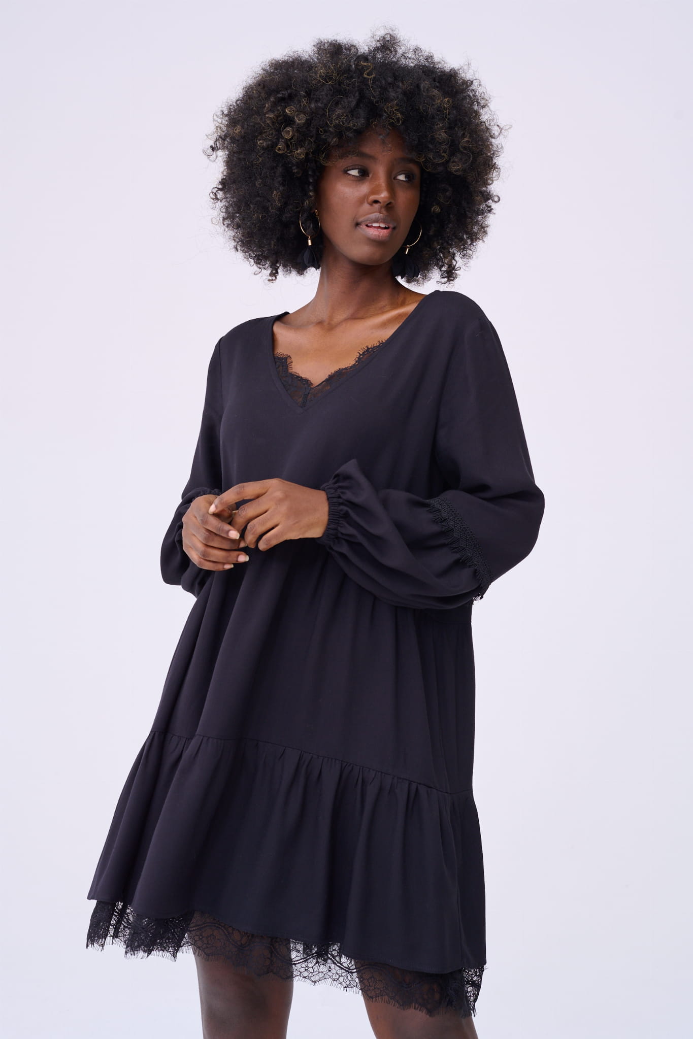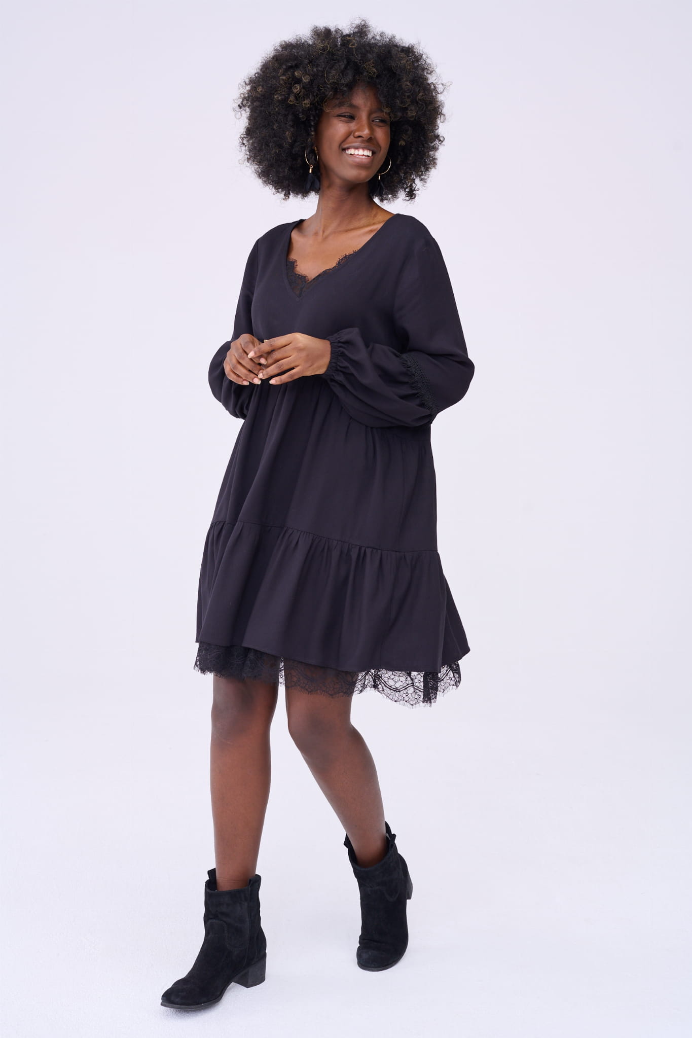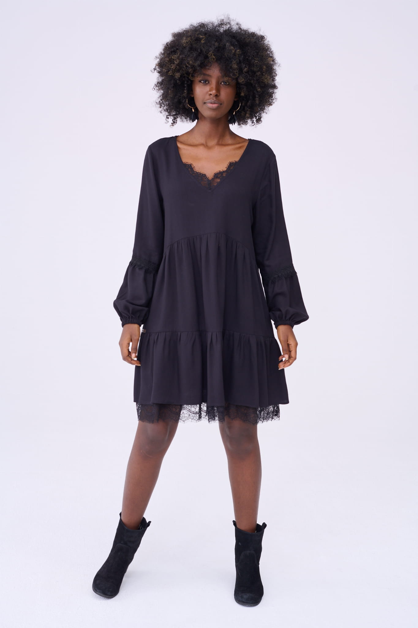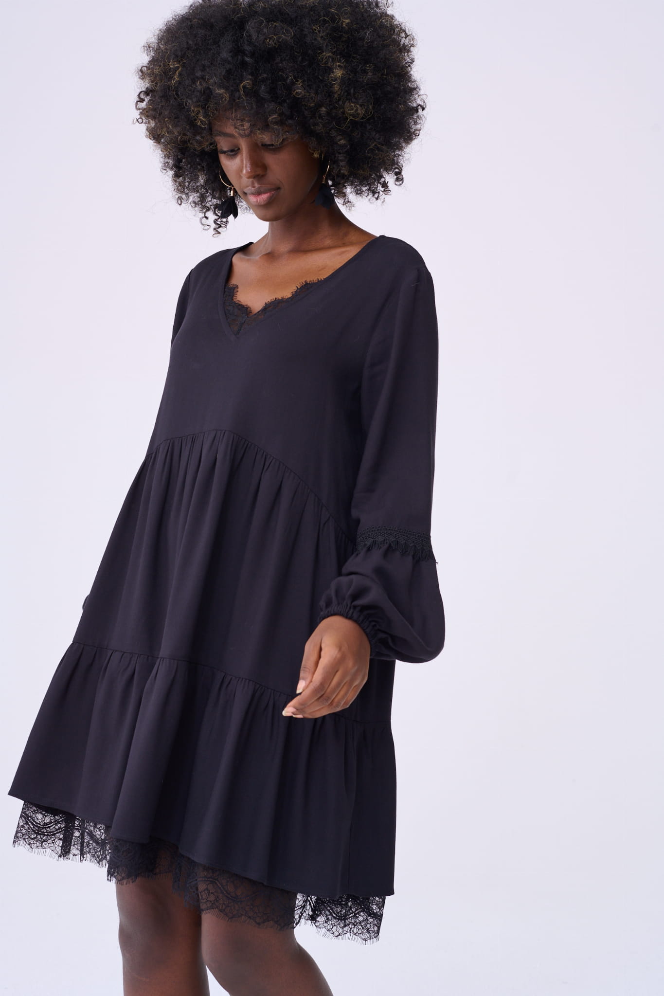 Romantyczne detale obejmują dekolt w kształcie litery V ozdobiony koronką z przodu i z tyłu, z regulowanymi wiązaniami z tyłu dla idealnego dopasowania. Długie rękawy są zaakcentowane koronkowymi wstawkami i elastycznymi mankietami, a spódnica ma dwa marszczone poziomy, każdy wykończony ozdobną koronką dla dodatkowego akcentu boho.