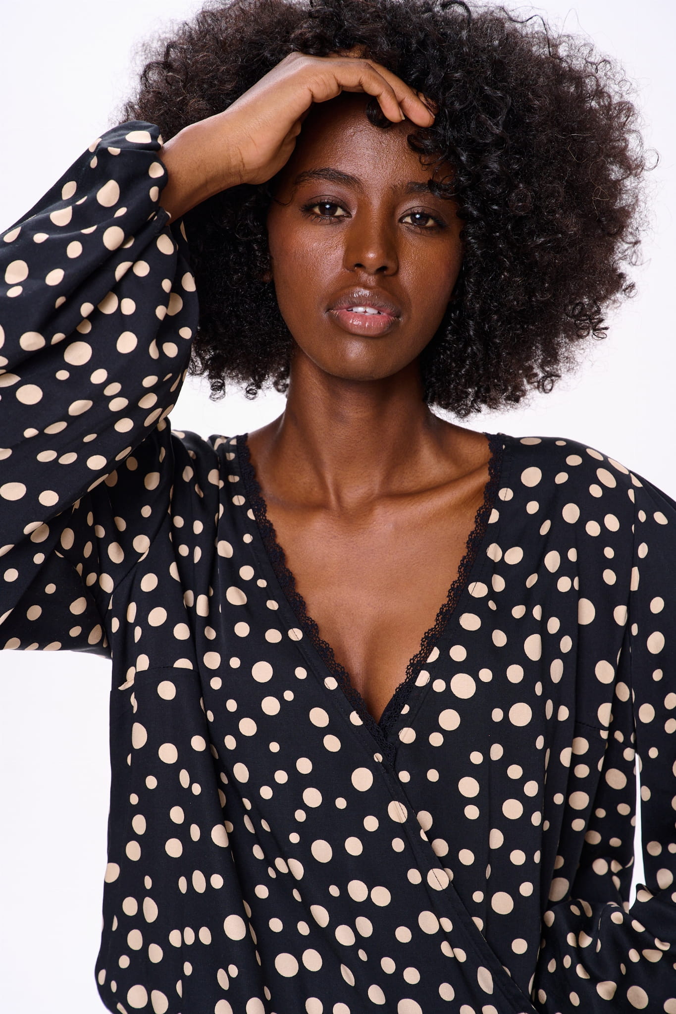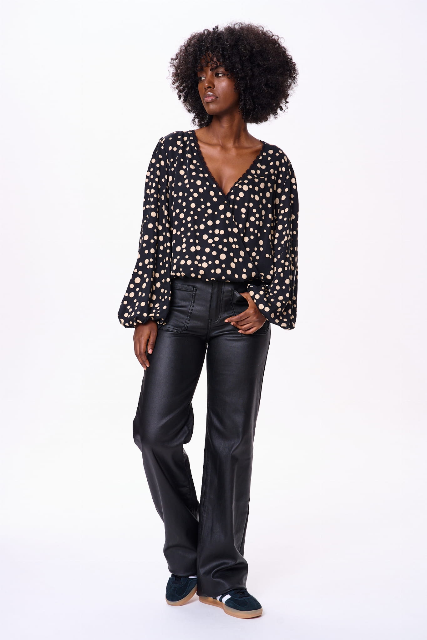 Bluzka Darcy to idealne połączenie stylu i wygody, o regularnym kroju, szykownym dekolcie w serek i eleganckich długich rękawach w kształcie dzwonu. Wykonana w Polsce w 100% z wiskozy, zapewnia miękkość i oddychalność, idealną na każdą porę roku. Ponadczasowy czarny materiał z zabawnymi kropkami dodaje Twojej garderobie odrobinę wyrafinowania, dzięki czemu jest uniwersalna zarówno na okazje codzienne, jak i formalne.