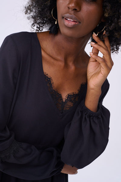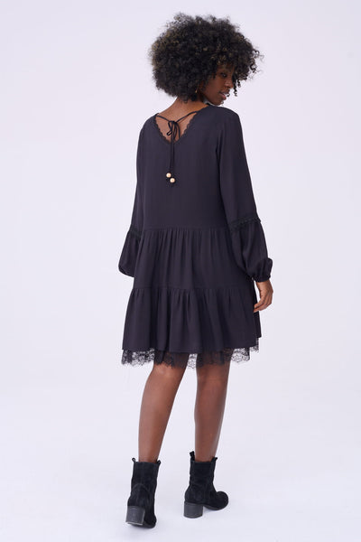 Romantyczne detale obejmują dekolt w kształcie litery V ozdobiony koronką z przodu i z tyłu, z regulowanymi wiązaniami z tyłu dla idealnego dopasowania. Długie rękawy są zaakcentowane koronkowymi wstawkami i elastycznymi mankietami, a spódnica ma dwa marszczone poziomy, każdy wykończony ozdobną koronką dla dodatkowego akcentu boho.